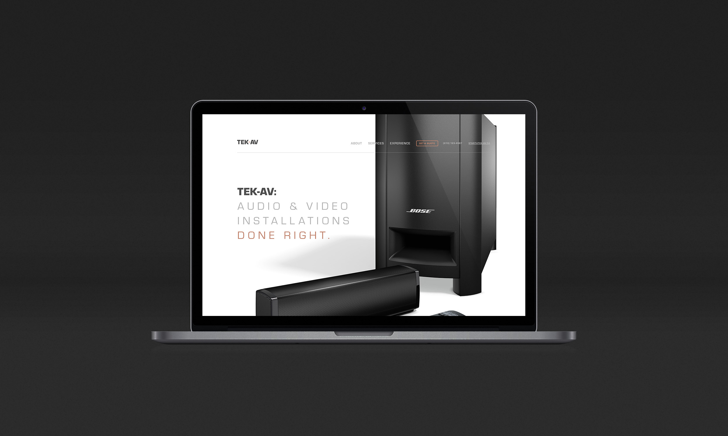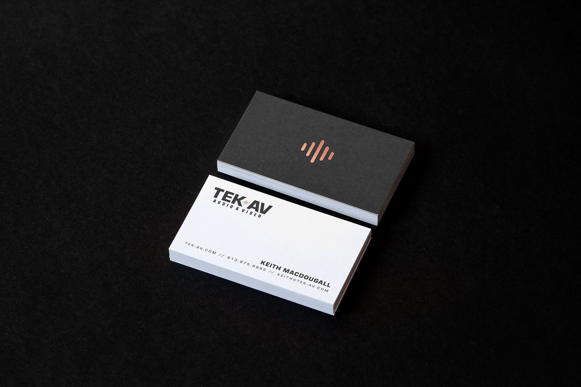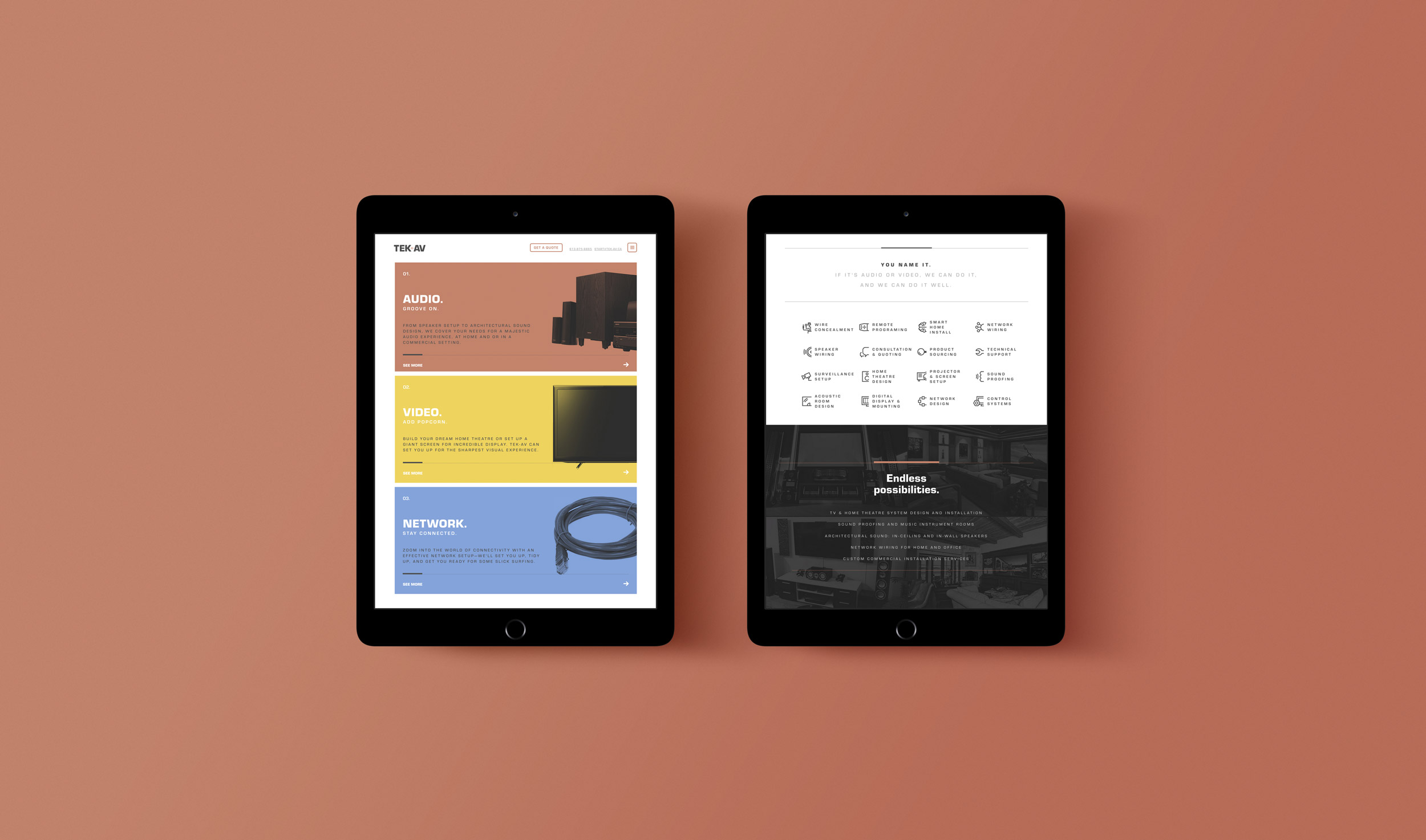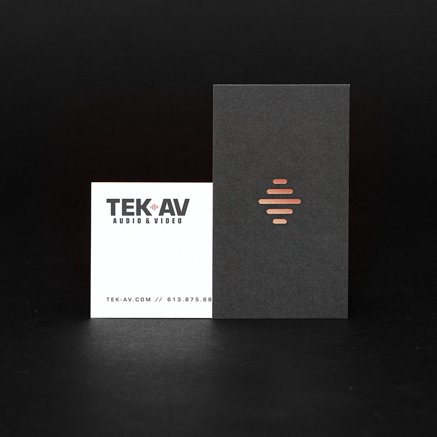 Newly-established Tek-AV is an Ottawa-based contracting service that specializes in the installation of home entertainment systems. We created an identity that spoke to the owner's love for craftsmanship. The design and typography pay homage to classic audio gear from the 70s and 80s, while using a spot of copper colour and foil pays tribute to the materials of the trade. Our goal was to capture the mood of a home theatre experience. This project included logo design, brand collateral, and website design and development.www.tek-av.com